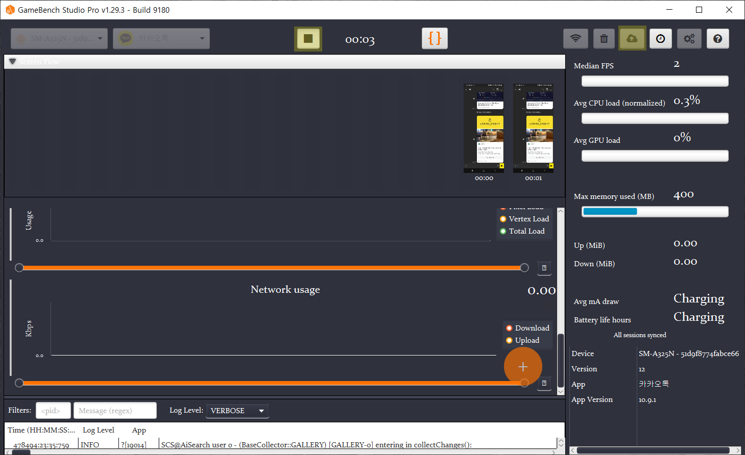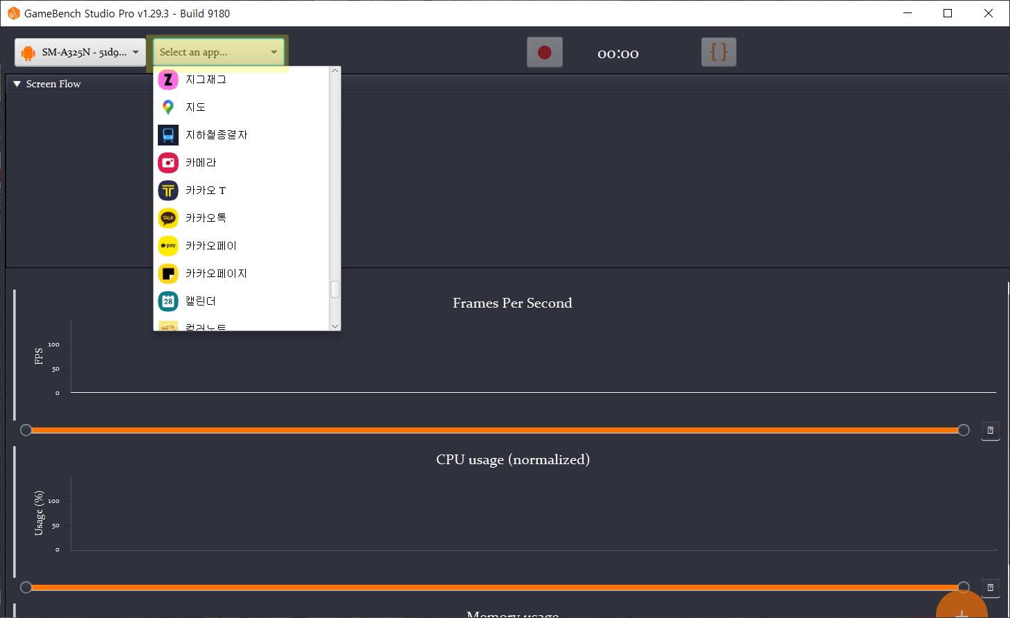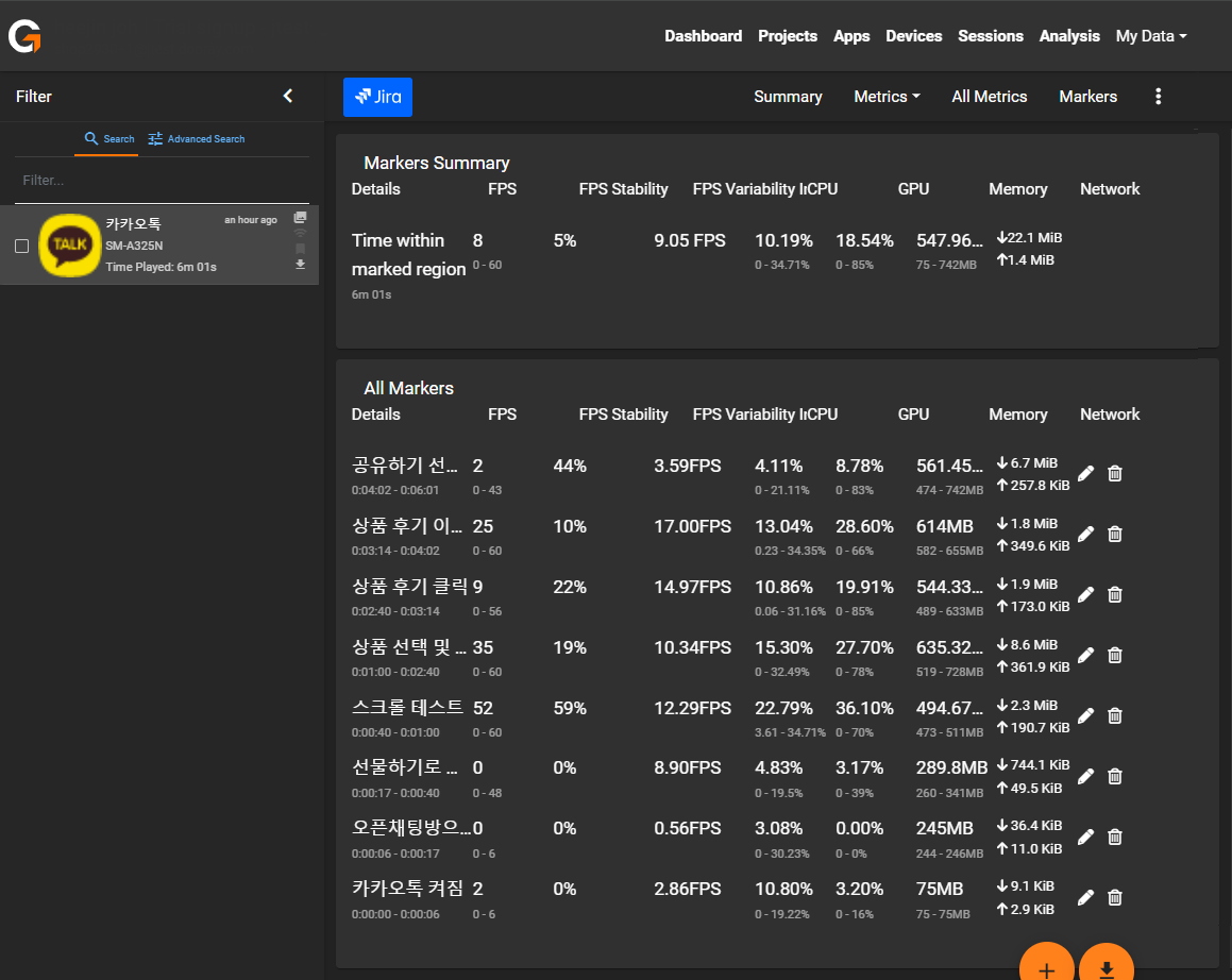 - 중앙 차트에는 프레임 속도와 CPU사용량, 메모리 사용량이 실시간으로 표시된다.