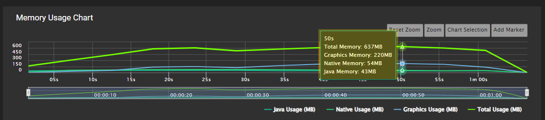 - 아래 그리프를 보면, 시간이 지날수록 메모리 사용량이 증가하고 Peak Memory Usage 는 637MB 이다.