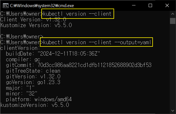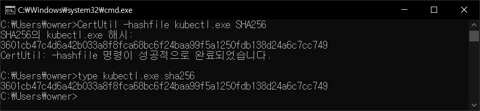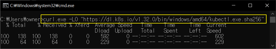 - cmd > curl.exe -LO "https://dl.k8s.io/v1.32.0/bin/windows/amd64/kubectl.exe.sha256" 입력