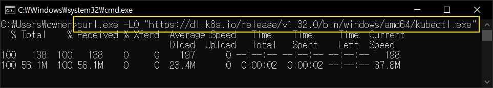 - cmd > curl.exe -LO "https://dl.k8s.io/release/v1.32.0/bin/windows/amd64/kubectl.exe" 입력