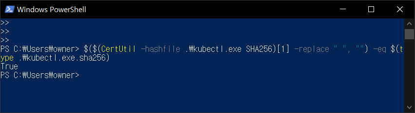 $($(CertUtil -hashfile .\kubectl.exe SHA256)[1] -replace " ", "") -eq $(type .\kubectl.exe.sha256)