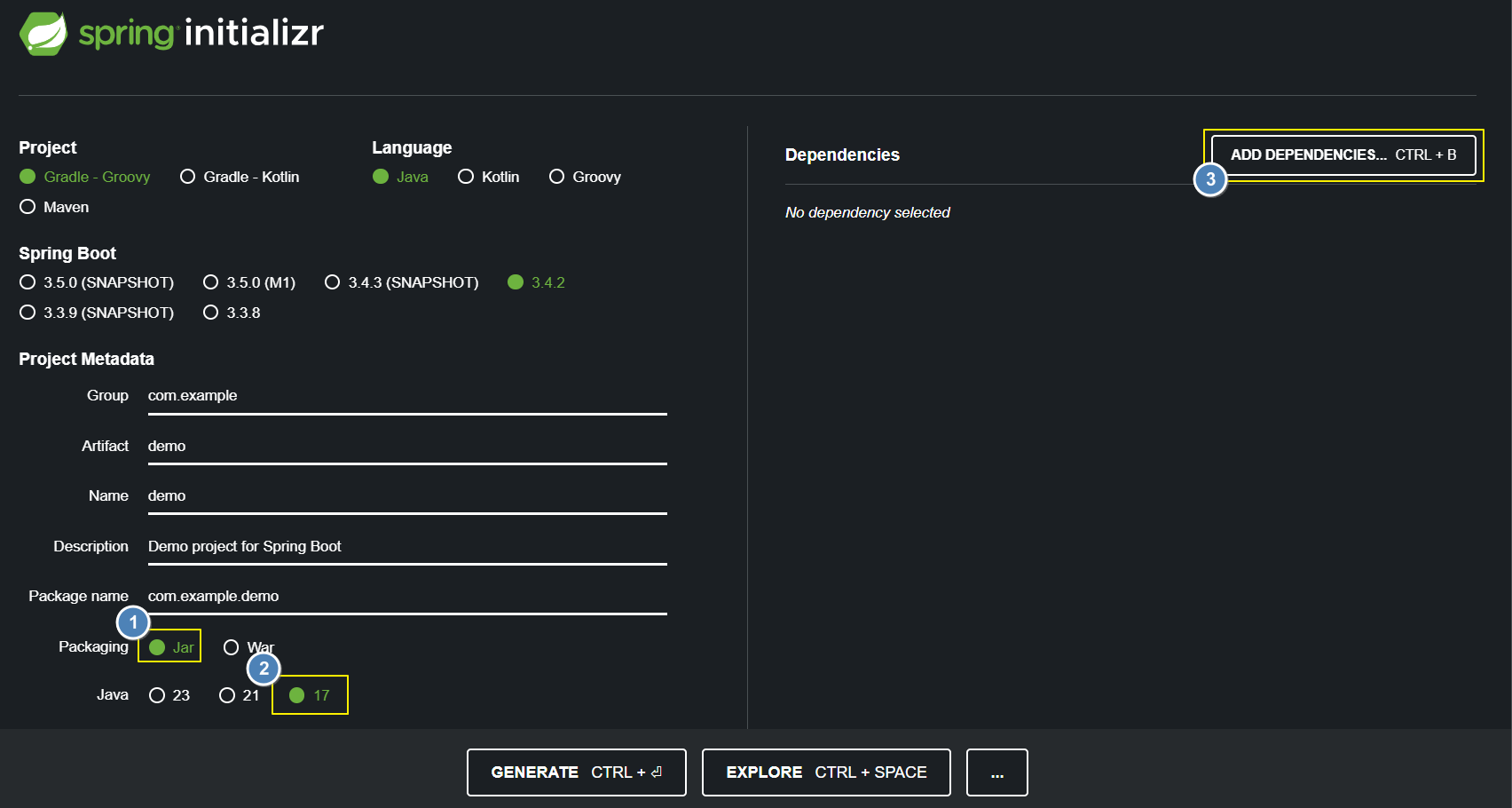 - 스프링 부트 생성 도구 사이트 에서 dependences 추가