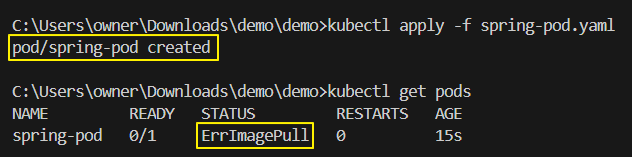 # pod 로 생성한다 apiVersion: v1 kind: Pod # pod 에 대한 기본 정보 생성 metadata : name : spring-pod # spec에 대한 세부 정보 지정. spec : containers : - name : spring-container # spring-server image를 활용하여 image 를 띄울 것 image : spring-server ports: - containerPort: 8080 - 매니페스트 파일을 기반으로 pod 생성 후 확인하기