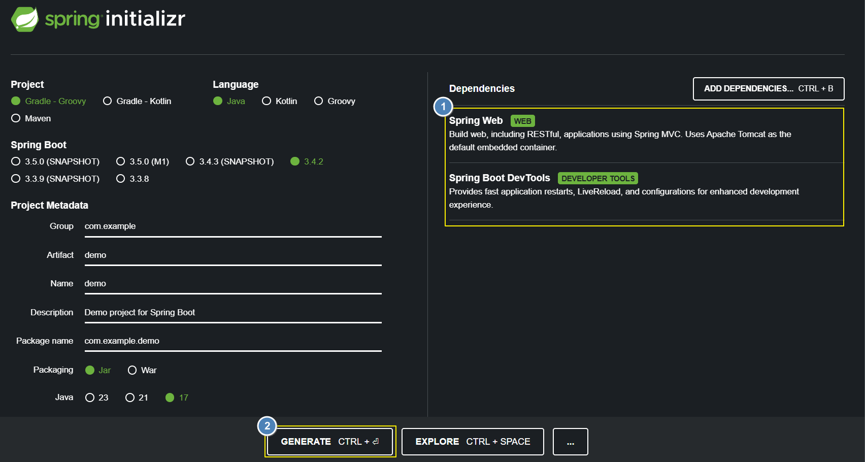 - Spring Web, Spring Bool DevTools 추가 후 Generate