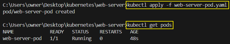 apiVersion: v1 kind: Pod metadata: name: web-server-pod spec: containers: - name : seb-server-container image : my-web-server:latest imagePullPolicy : IfNotPresent ports: - containerPort : 80 - Pod 생성하기