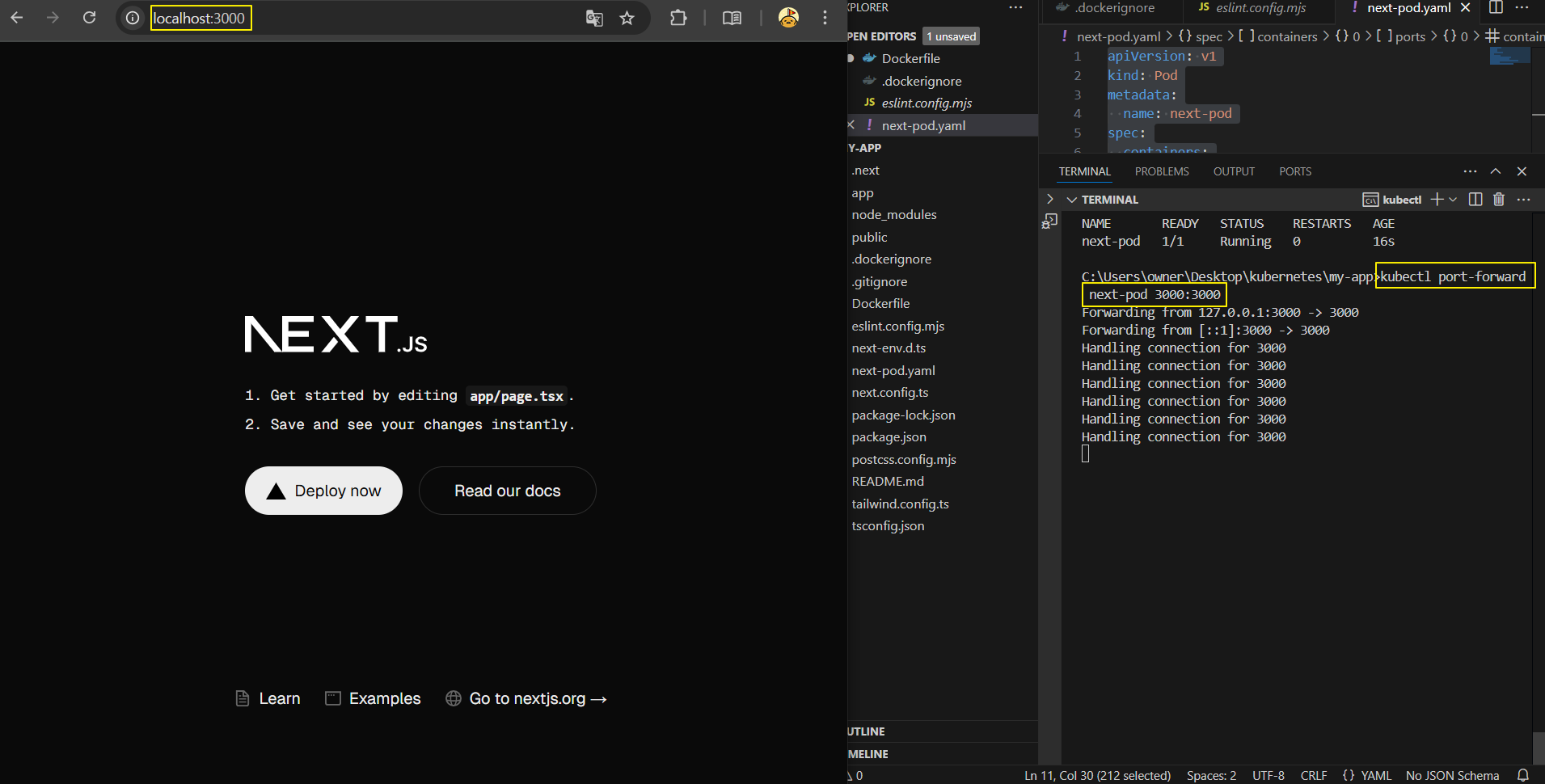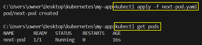 apiVersion: v1 kind: Pod metadata: name: next-pod spec: containers: - name: next-container image: next-server imagePullPolicy: IfNotPresent ports: - containerPort: 3000 - Pod 생성하기