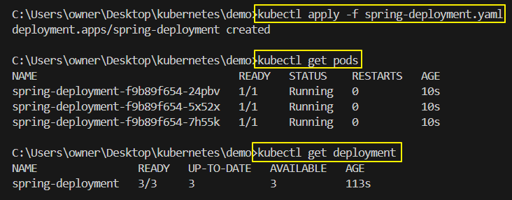 apiVersion: apps/v1 kind: Deployment metadata: name: spring-deployment # deployment 의 세부 정보 spec: # 생성할 pod 의 개수를 작성한다. replicas : 3 # "app:backend-app" 이라는 lable 을 가진 파드를 # deployment를 활용하여 배포한다는 것을 의미한다. selector : matchLabels: app: backend-app # 배포할 pod의 정보를 작성한다. template: metadata: # 카테고리를 의미한다. labels: app: backend-app # pod 의 스펙을 정의한다. spec: containers: - name : spring-container image: spring-server imagePullPolicy: IfNotPresent ports: - containerPort: 8080 - deployment 생성한 뒤 확인하기