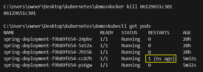 - RESTARTS 가 1이 늘어난 것을 확인할 수 있다.