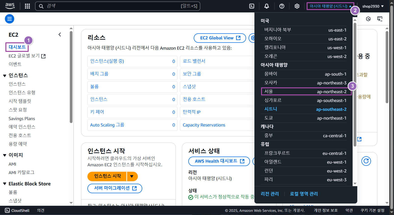 - 대시보드 - 리전 선택하기 - 서울 선택하기