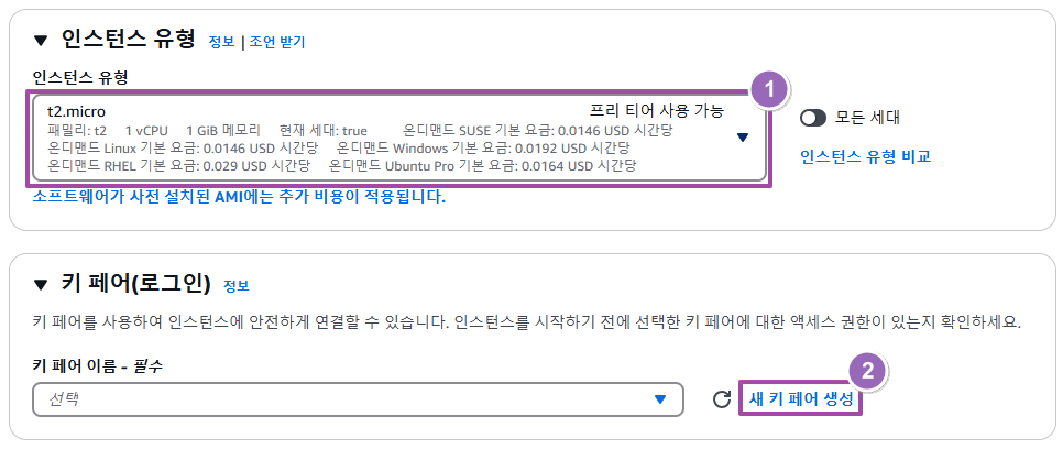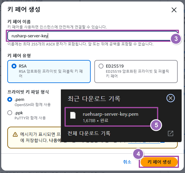 - 키 페어 이름은 어떤 EC2컴퓨터에 접근하기 위한 키페어인지 명시해두는 것이 좋다.