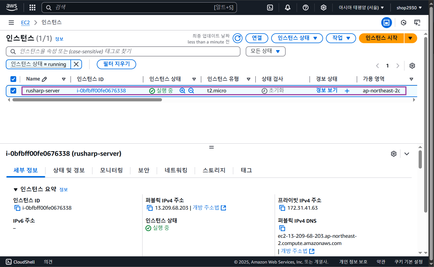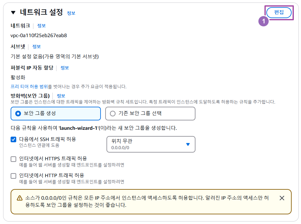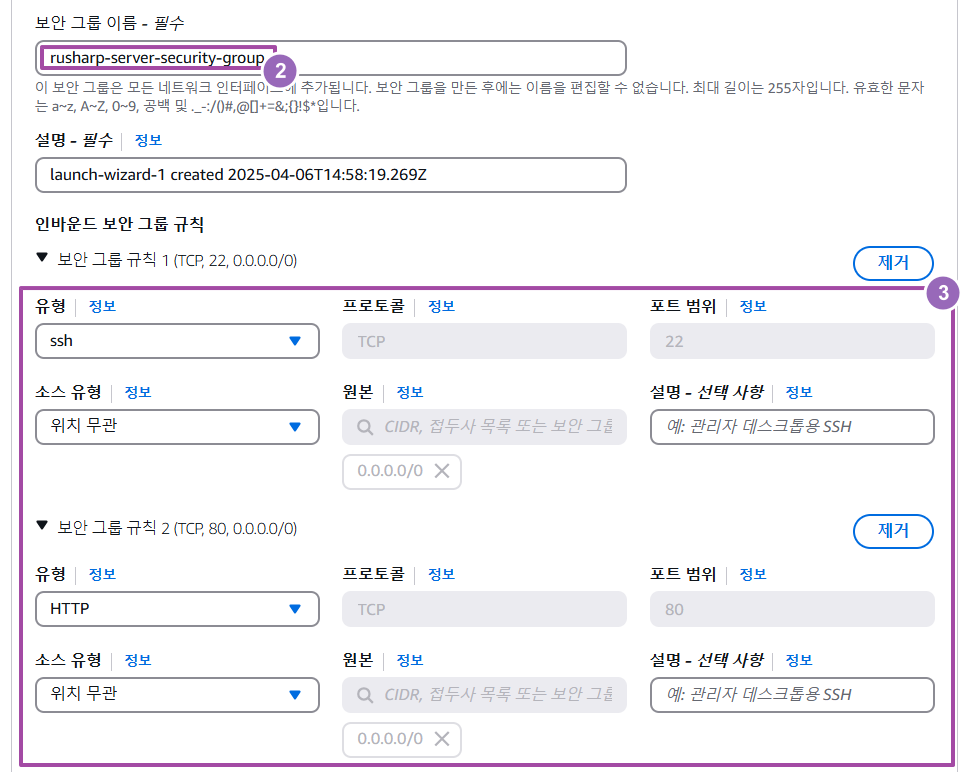 - 보안 그룹을 선택할 때, 허용 IP 범위와 포트를 설정할 수 있다.