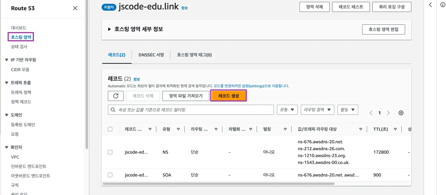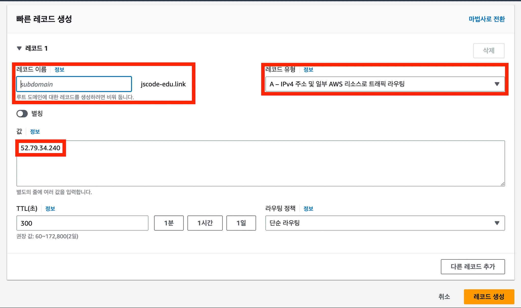 - 레코드 유형 : 도메인에서 ip4주소로 트래픽을 라우팅하기 위해 `A`를 선택한다.
