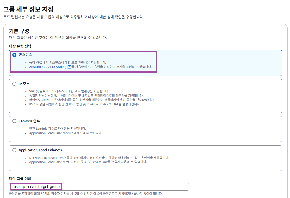 - ELB 의 HTTP 프로토콜을 사용하여 80번 포트로 들어온 요청은 전부 rusharp-server-target-group 의 인스턴스로 분배하여 트래픽을 보냄.