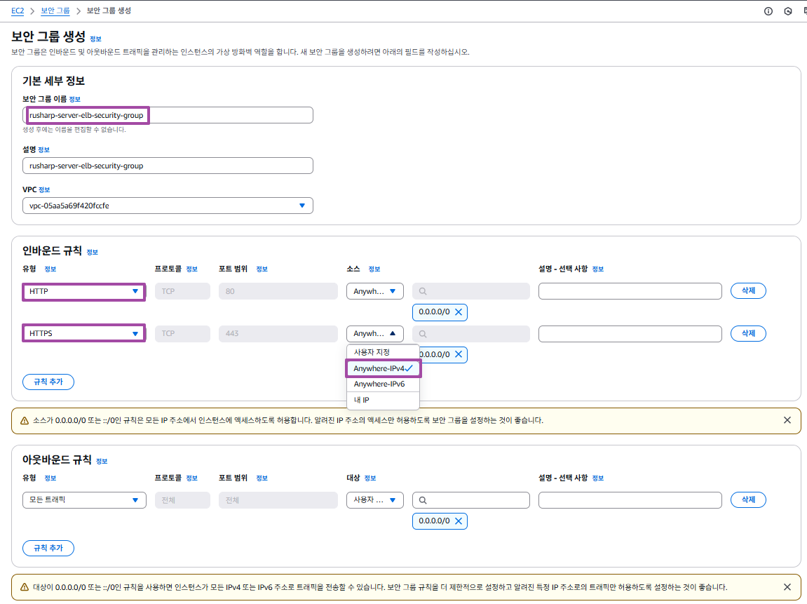 - EC2 > 보안 그룹 > 보안 그룹 생성하기