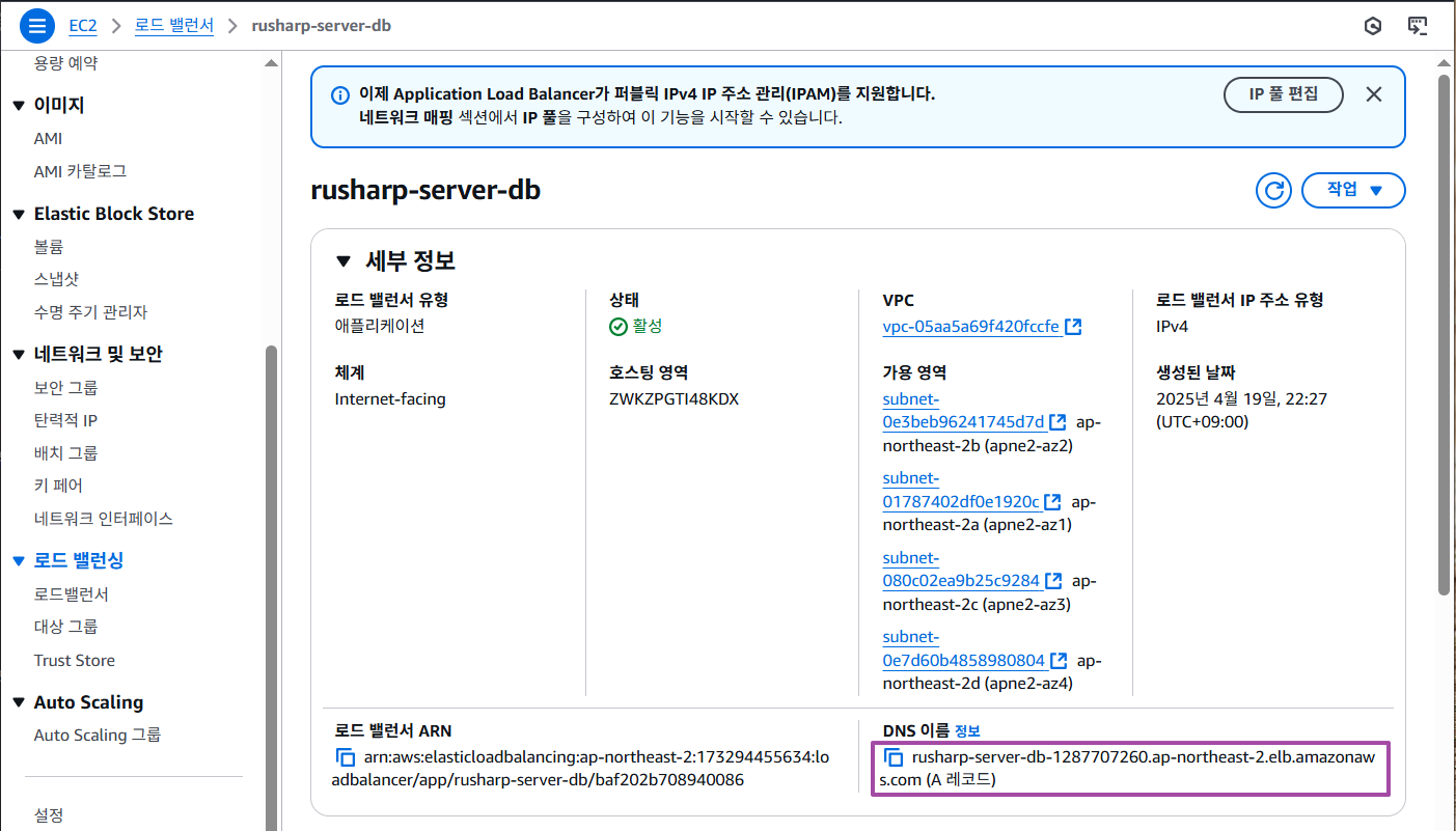 - EC2 > 로드 밸런서 > 로드 밸런서 선택하여 DNS 이름 확인.
