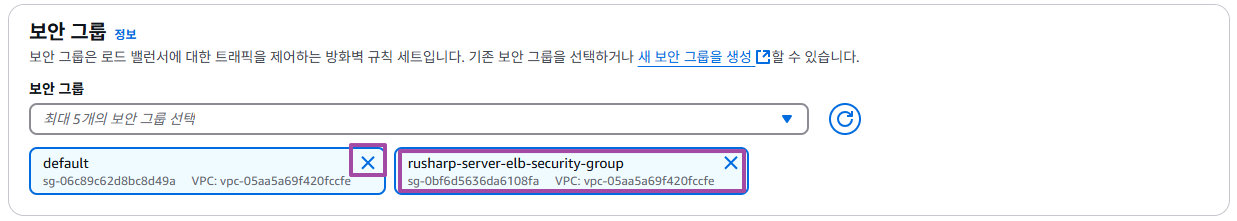 - 기존 보안 그룹 (default) 삭제 > 위에서 생성한 보안 그룹 선택