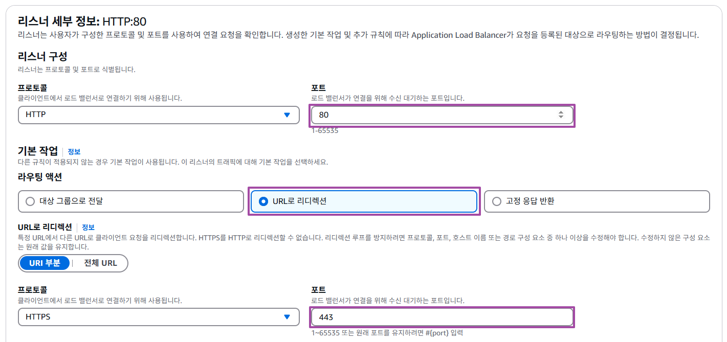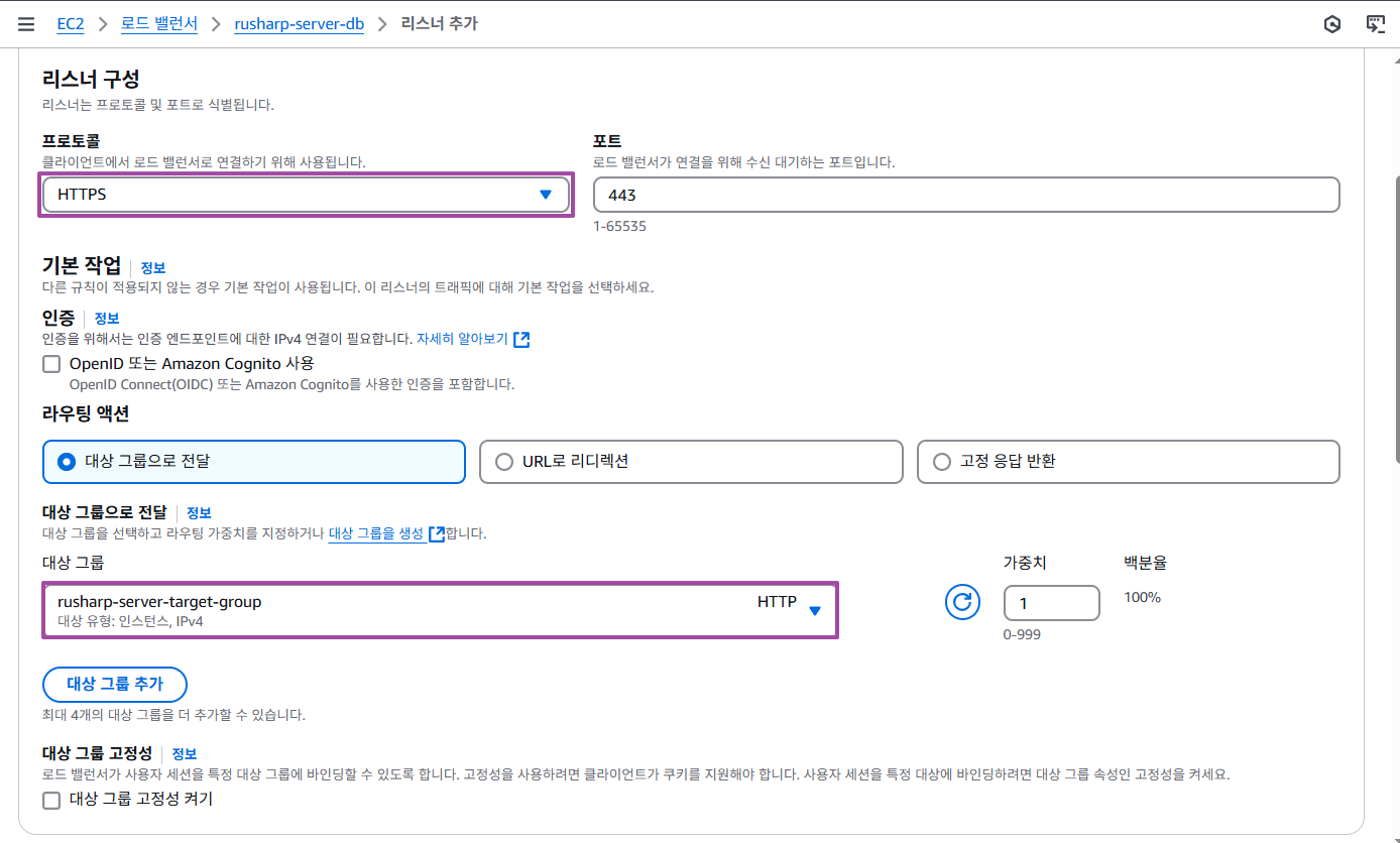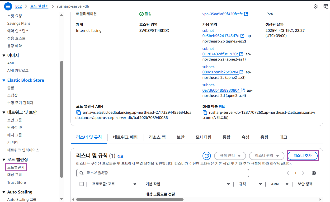 - 로드밸런서 > 항목 선택 > 리스너 및 규칙 추가하기
