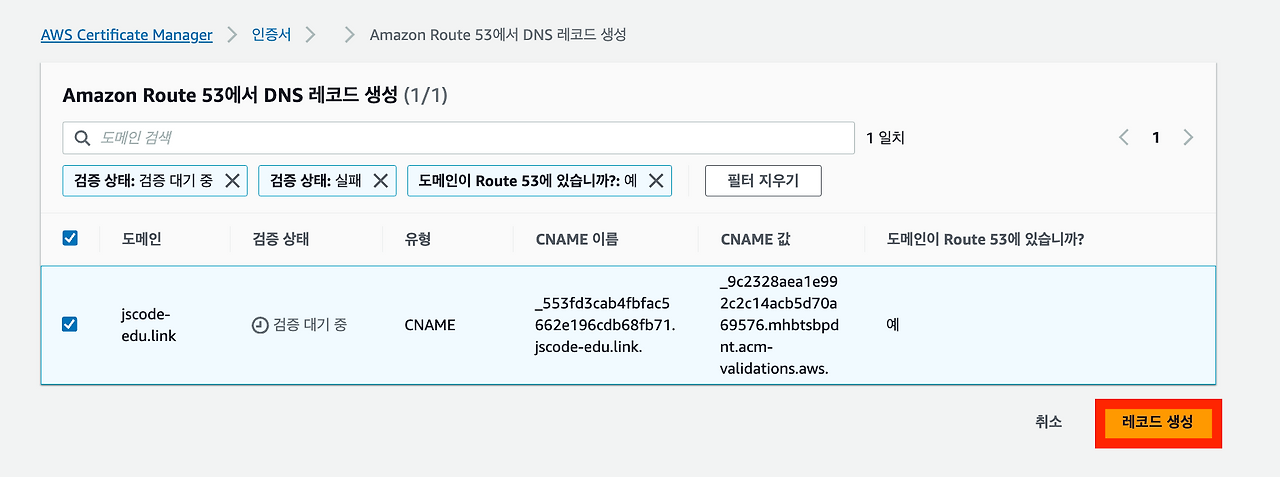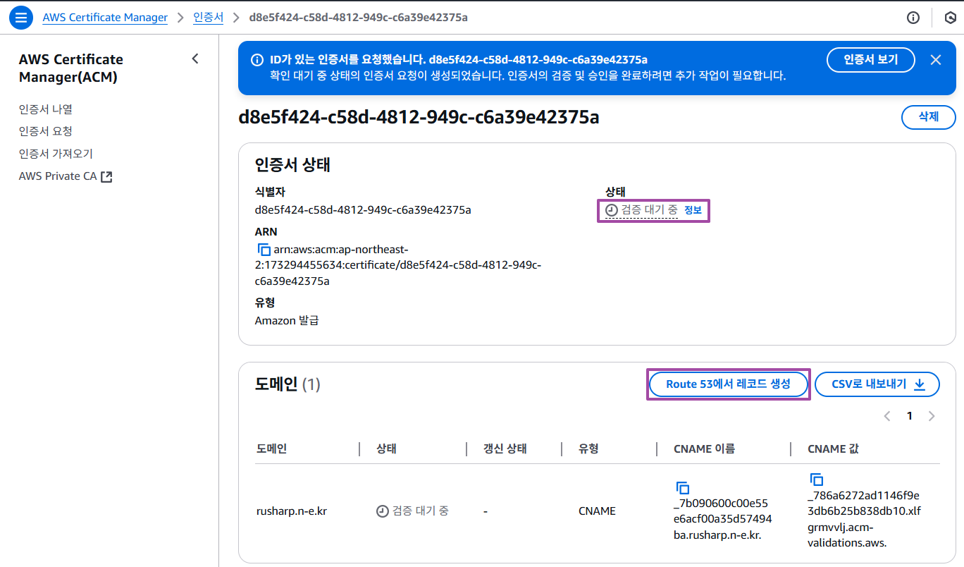 - 검증 대기중은 CNAME 을 통해 본인이 해당 도메인의 주인임을 인증하기를 기다리는 상태이다.