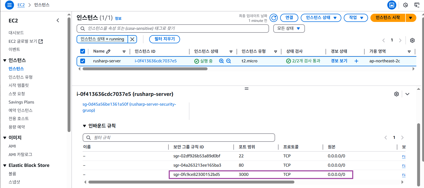 - EC2 > 인스턴스 > 보안 그룹의 인바운드 규칙에 3000포트 있는지 확인