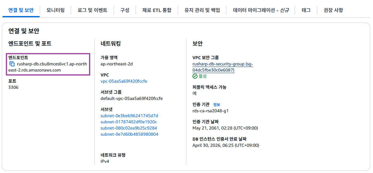 - RDS > 데이터베이스 의 엔드포인트 확인하기