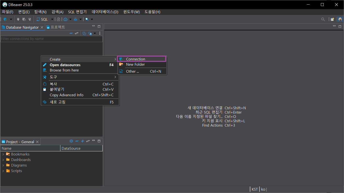 - Database 우클릭 후 DB 생성하기