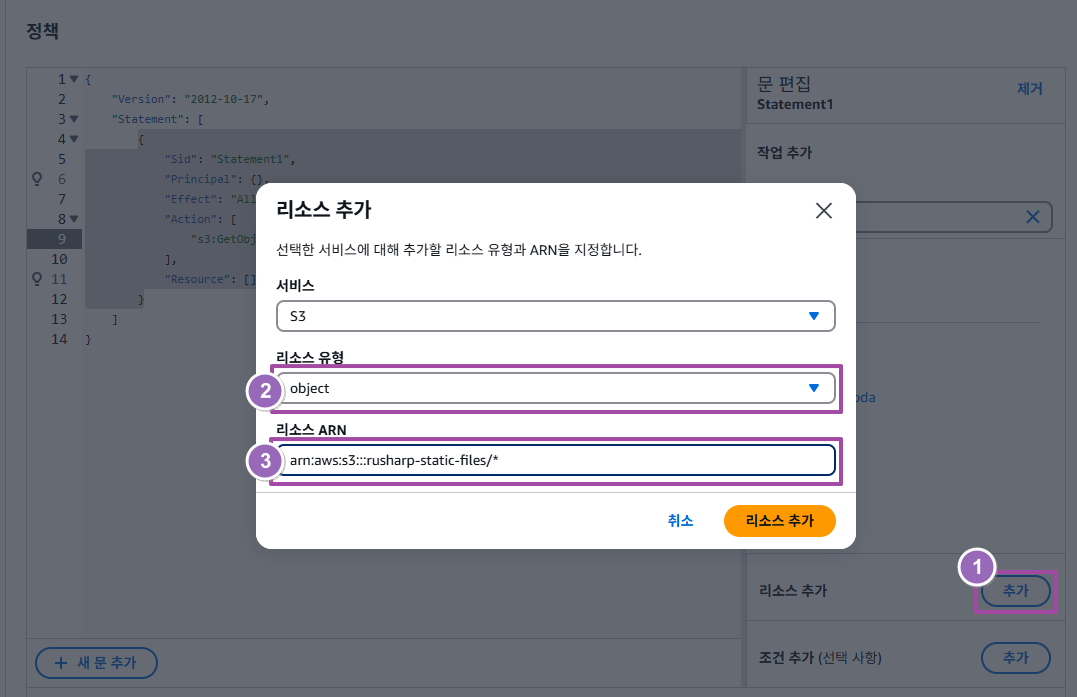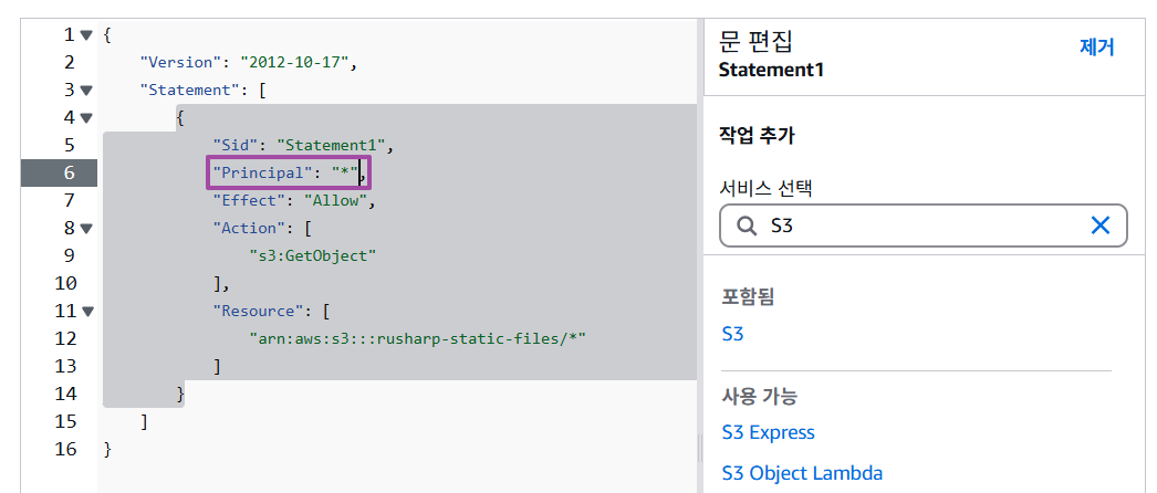 - rusharp-static-files 라는 버킷의 모든 파일을 리소스 대상으로 정함.