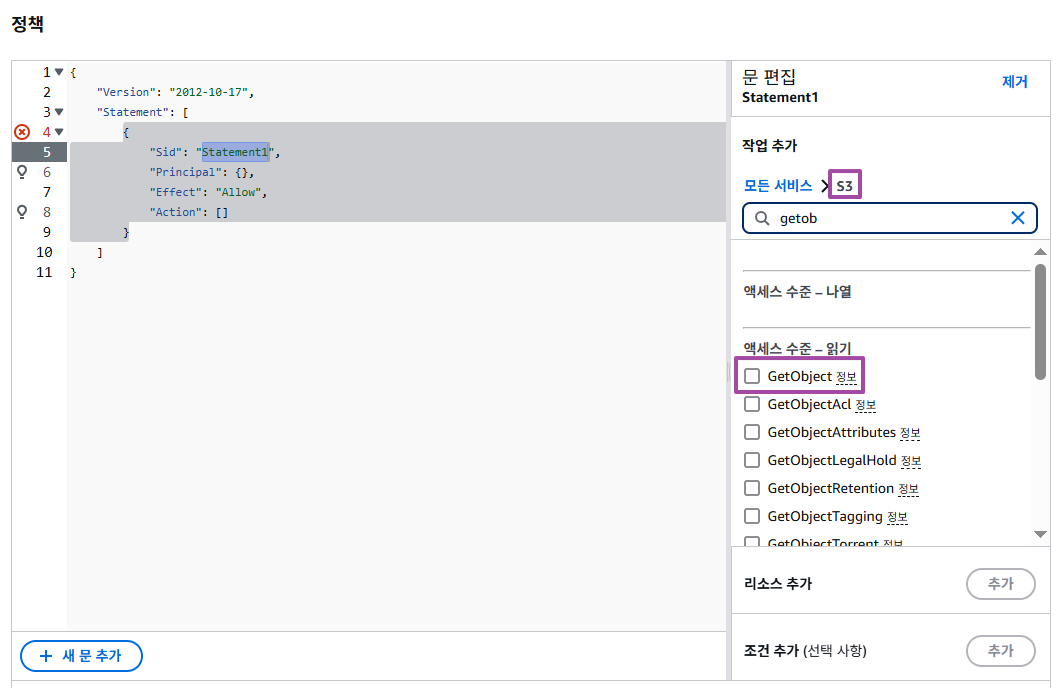 - S3 의 Getobject 선택하여 object를 조회할 수 있는 기능을 추가함