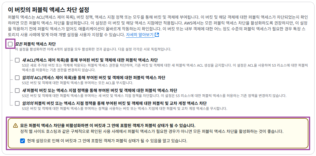 - 버킷 퍼블릭 엑세스 차단 설정에서 모든 퍼블릭 엑세스 차단 해제