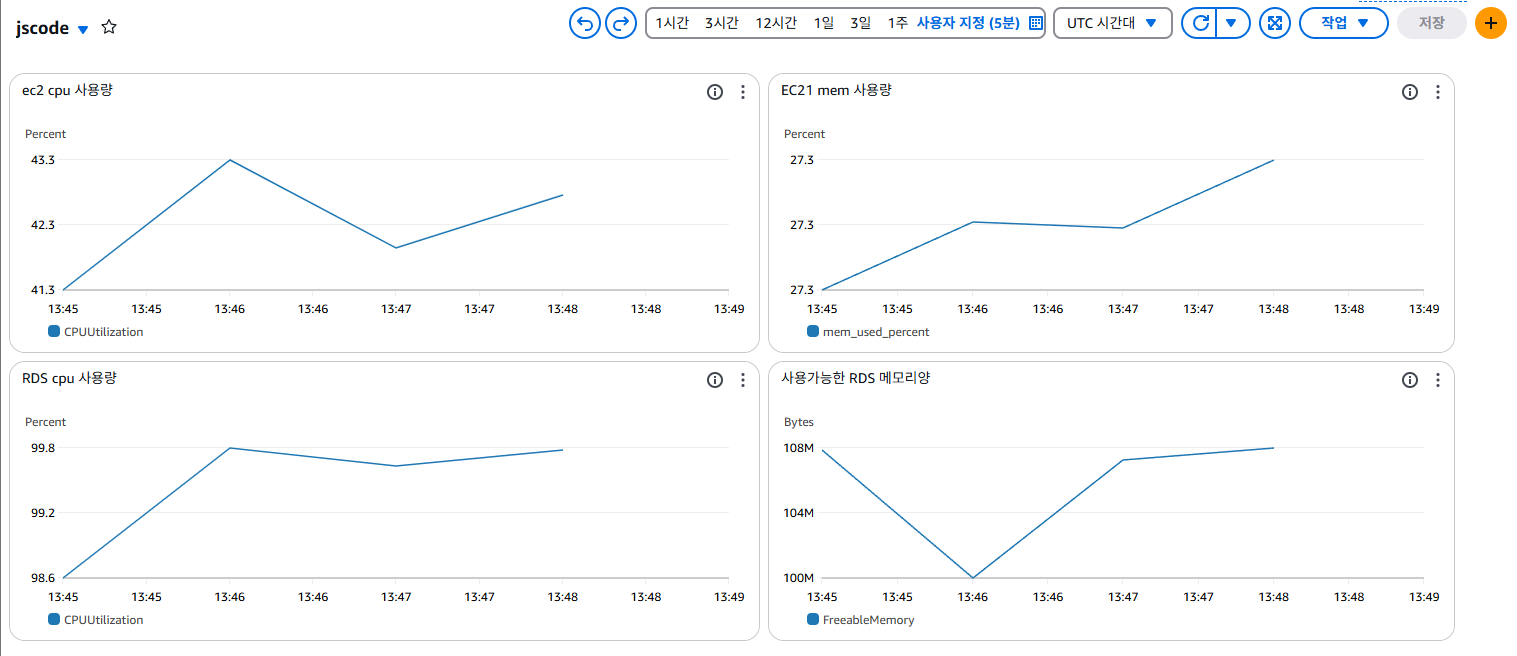 - EC2, RDS의 cpu, memory사용량을 Cloudwatch > 대시보드를 통해 확인하기