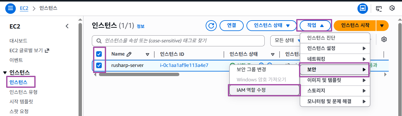 EC2에서 인스턴스 체크박스 선택하고 우측 상단 작업 > 보안 > IAM 역할 수정 버튼을 클릭한다.