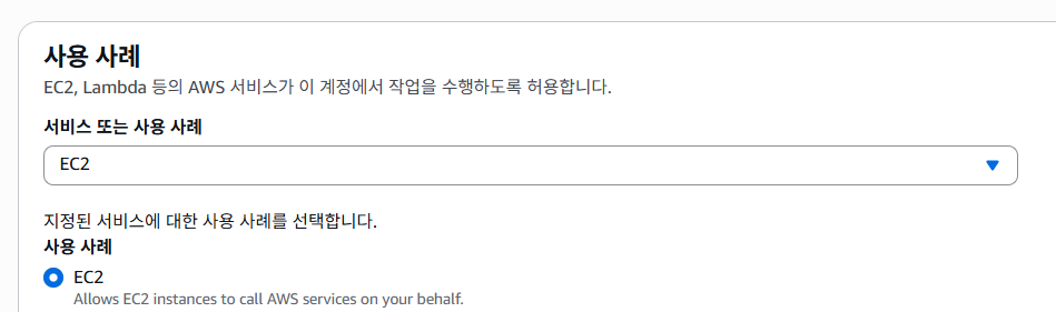 IAM > 역할 > 역할 생성에서 사용 사례에 EC2를 입력한 뒤 권한 정책에서
