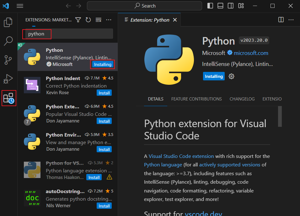 4. vs code에서 확장 기능 선택 > python 검색 > 최상단 기능 install