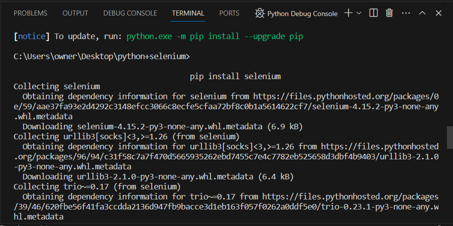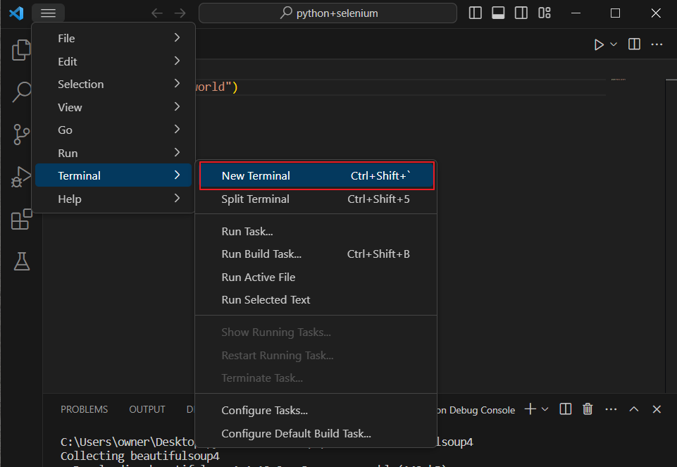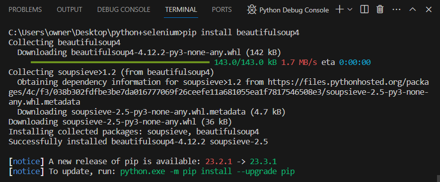 6. 터미널에 pip install beautifulsoup4 입력 후 enter