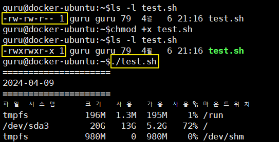 - 디스크 사용 출력 쉘 스크립트 생성 + 실행해보기