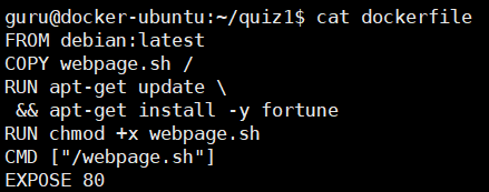 && apt-get install -y fortune : 업데이트 및 fortune 설치 - RUN chmod +x webpage.sh : webpage.sh 실행퍼미션 할당.