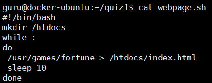 #!/bin/bash mkdir /htdocs while : do /usr/games/fortune > /htdocs/index.html sleep 10 done - 컨테이너에 fortune 애플리케이션 설치 : apt -get install fortune (업데이트가 먼저 와야 함)