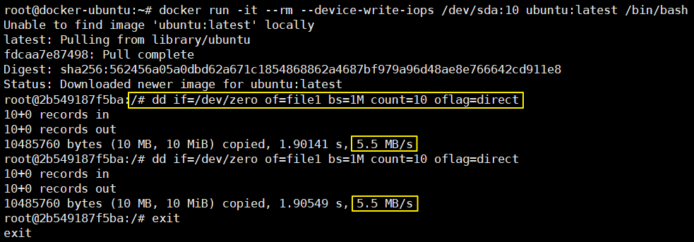 - docker run -it --rm --device-write-iops /dev/sda:100 ubuntu:latest /bin/bash