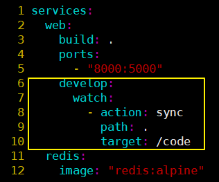 - 파일이 변경될 때마다 Compose는 파일을 /code컨테이너 내부의 해당 위치에 동기화함.