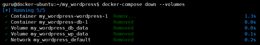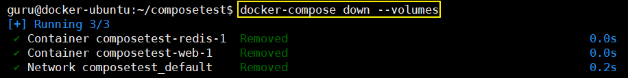 - docker-compose에서 만들어진 volumes도 동시에 삭제됨.