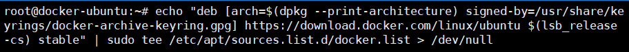 - echo "deb [arch=$(dpkg --print-architecture) signed-by=/usr/share/keyrings/docker-archive-keyring.gpg] https://download.docker.com/linux/ubuntu $(lsb_release -cs) stable" | sudo tee /etc/apt/sources.list.d/docker.list > /dev/null