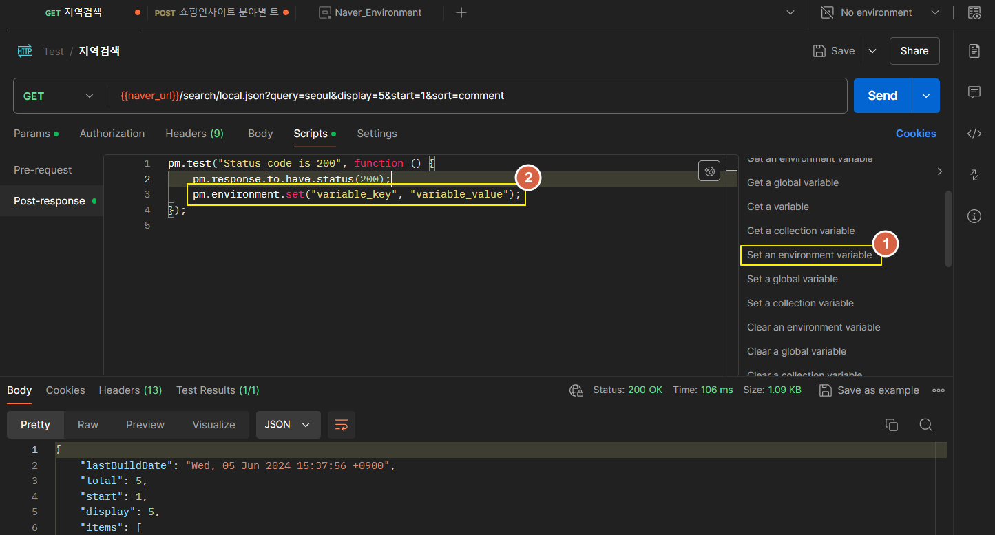 - 다시 Post-response 탭으로 돌아와서 우측에 `Set an environment variable 선택