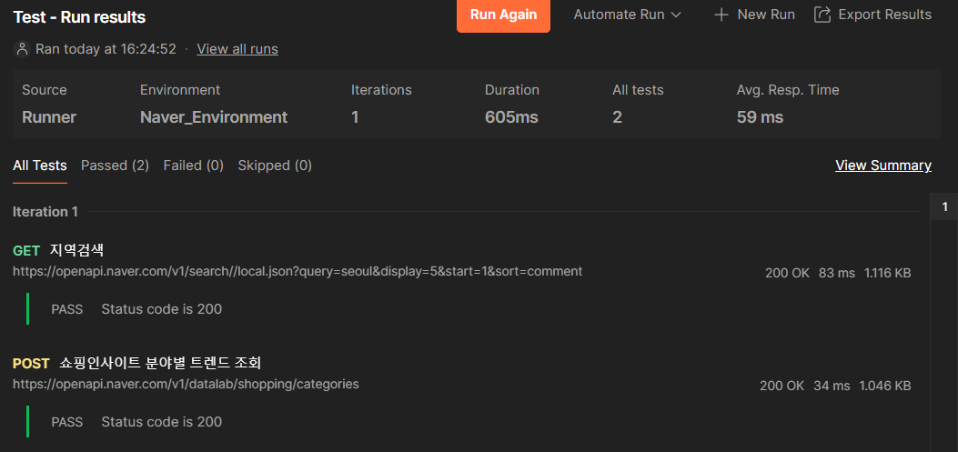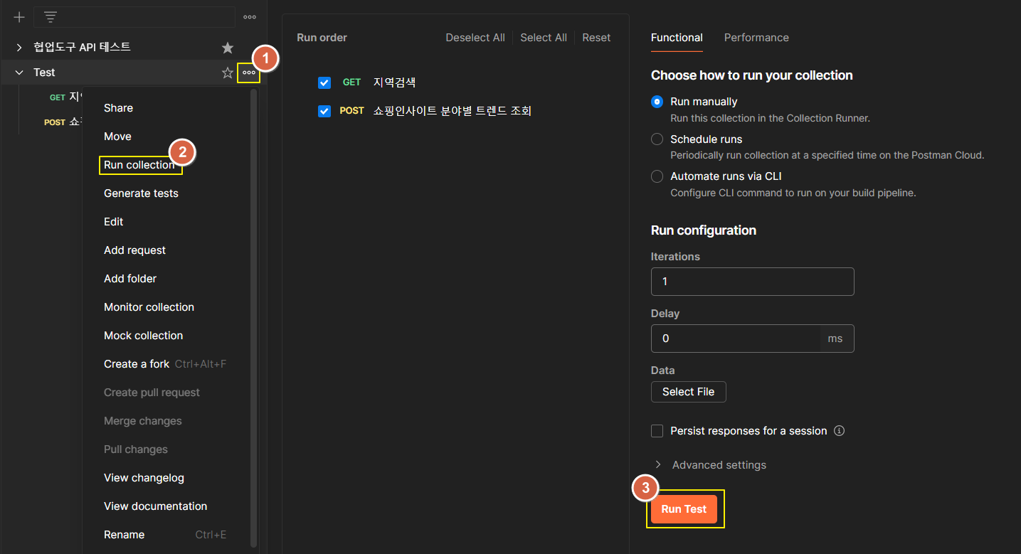 - collection 우측 더보기 > Run collections > Run Test 선택