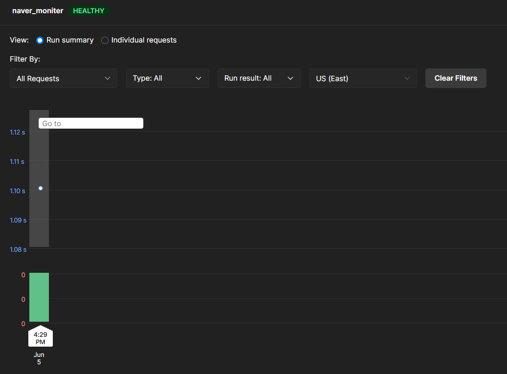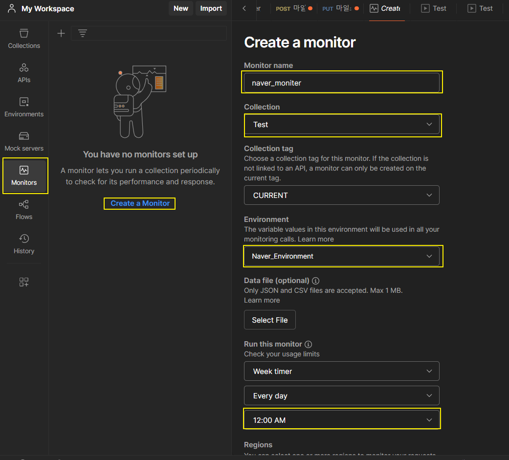 - LNB 의 Moniter 탭으로 이동 > Create a Moniter > 모니터 이름, 컬렉션, 환경 등등 설정 후 Create a Monitor