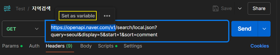 - naver api 테스트하는 것들 중 공통적인 url 부분을 변수로 처리할 수 있음.