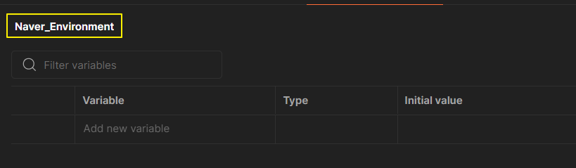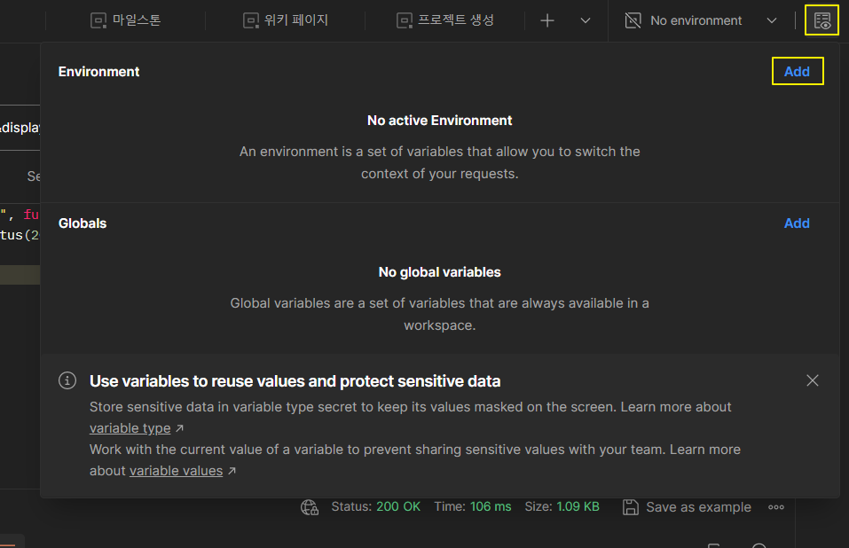 - 우측 상단 No Environment 클릭 후 아까 생성한 Environment 선택