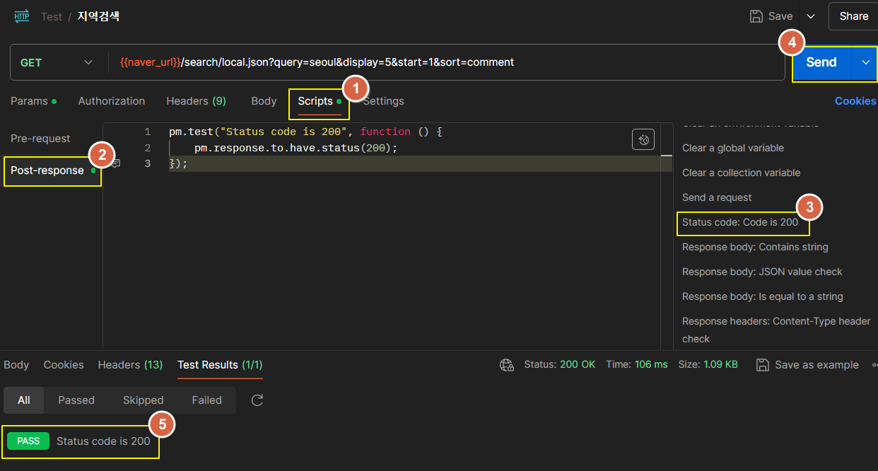 - Scripts > Post-request 에서 우측 RNB 의 `Status code: Code is 200` 클릭하면 자동으로 코딩이 들어감.