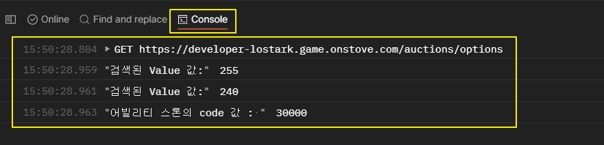 var response = pm.response.json(); // 어빌리티 스톤에 포함되는 카테고리 번호 let categories_code response.Categories.forEach(option =>{ if (option.CodeName == "어빌리티 스톤"){ categories_code = option.Code console.log("어빌리티 스톤의 code 값 : ", option.Code) } }) pm.environment.set("categories_code", categories_code); - 하단 console 값 확인