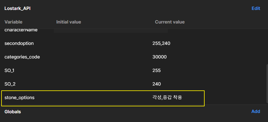 var response = pm.response.json(); // 어빌리티 스톤의 값 (각성,중갑 착용) let stone_options = pm.environment.get("stone_options").split(","); // `각성`과 `중갑 착용` 값을 가진 Value 변수에 삽입. // response 값 중에서 Etcoptions 를 가진 배열을 각 요소에 대해 콜백 함수 실행. // python 으로 따지면 for option in response.EtcOptions 와 비슷함. response.EtcOptions.forEach(option =>{ // 하위에 EtcSubs 가 있는지 확인 && Text 값이 "각인 효과" 인지 확인함. if (option.EtcSubs && option.Text == "각인 효과"){ // 각 option 값 중에서 하위의 각 요소에 대해 콜백 함수 실행. option.EtcSubs.forEach(sub =>{ // 각각의 값을 secondoption 에 각각 push 함. if(sub.Text == stone_options[0] || sub.Text == stone_options[1]){ secondoption.push(sub.Value); console.log("검색된 Value 값:", sub.Value); } }) } }) pm.environment.set("secondoption", secondoption); - 어빌리티 스톤에 해당하는 code 값 Environment Variable 로 입력