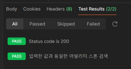 let stone_options = pm.environment.get("stone_options").split(","); pm.test("입력한 값과 동일한 어빌리티 스톤 검색", function () { var jsonData = pm.response.text(); pm.expect(jsonData).to.include(stone_options[0]); pm.expect(jsonData).to.include(stone_options[1]); }); - Test Results 값 확인