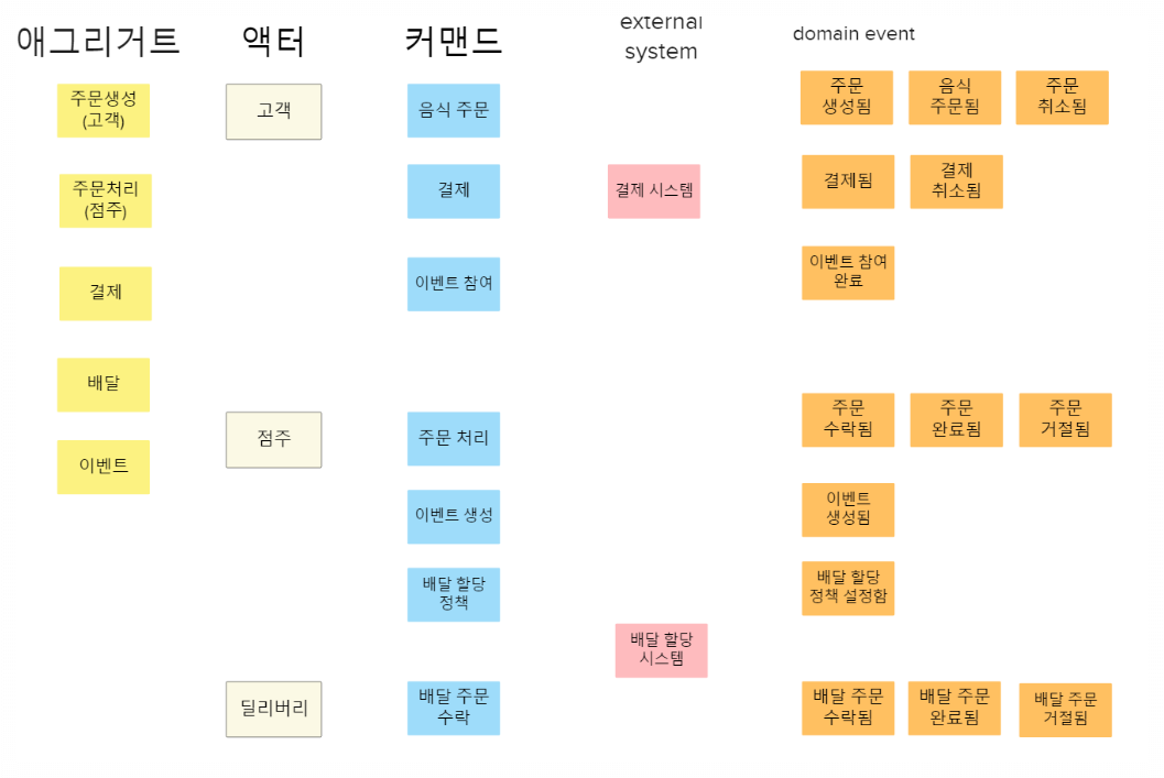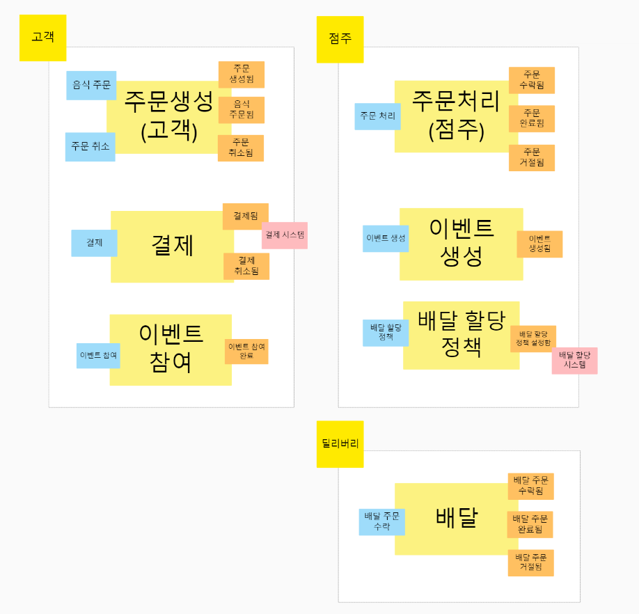 이후 이 링크를 참고하여 DDD를 그리고 액터별로 분리하자 이벤트, 배달 애그리거트가